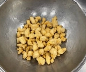 - Remove nuggets from oven or fryer after product has reached 165 degree and pour into a mixing bowl.