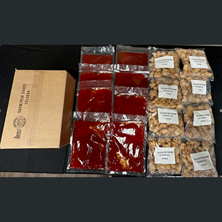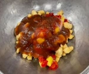 - Cut a corner of the warmed sauce pack and pour entire bag of sauce on nuggets and mix well until all coated nicely