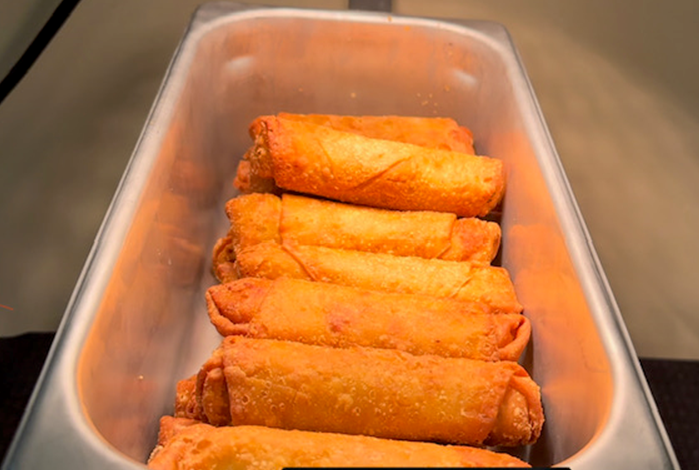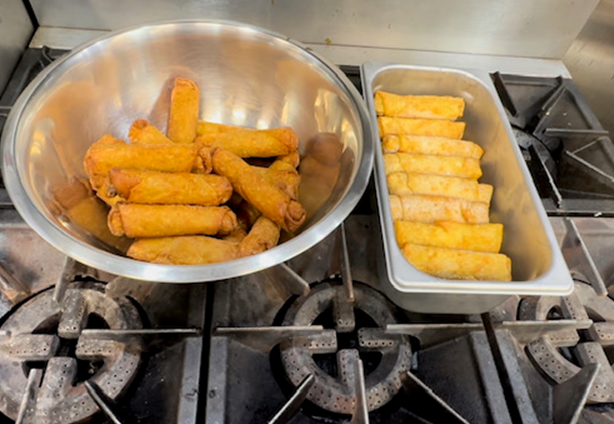 Use Heat resist glove to transfer cooked Egg Rolls into 1/3 hotel pan. For presentation purposes, place them one next to each other for better visual effect.