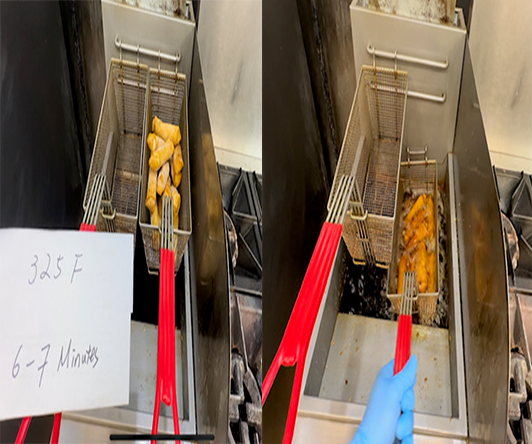 Depends on how busy the store, take out 16-24 pieces of Frozen Egg Rolls and drop them in 325 F Fryer for 6-7 minutes until outside are nice crispy and golden brown and internal temperature reaches 165 F