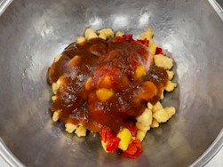 Corte una esquina del paquete de salsa y vierta toda la bolsa de salsa en nuggets y mezcle bien hasta que todo esté bien cubierto.