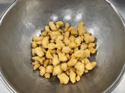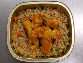 Agregue nuggets salsados por igual en la parte superior y central del arroz frito (o LoMien) a 4 recipientes a 0.50 lb (8 oz) cada uno