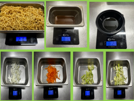 Use 1 bolsa / 2 libras de Lomein (descongelado), 3 oz de salsa (descongelada), 2 oz de aceite y 4 oz de cada verdura (aproximadamente 1 puñado) para 1 sartén de hotel de tamaño medio