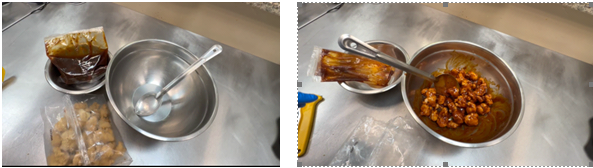 Combínalos en el tazón y mézclalos hasta que todo el pollo y la salsa estén cubiertos uniformemente.
