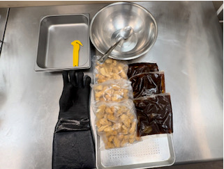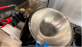 Use heat resisted glove to transfer Fried or Baked nuggets to mixing bowl ”