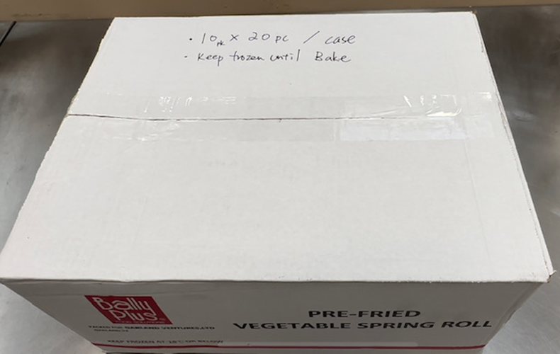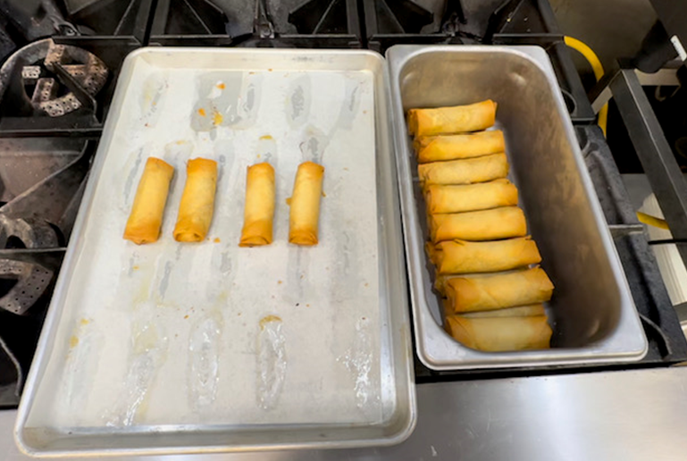 Depends how busy store gets, take out 1 or 2 packs of frozen spring rolls and place them on sheet pan with parchment paper.