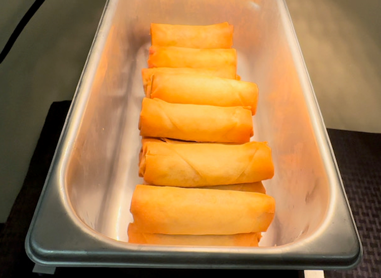 Transfer Spring Rolls pan immediately to hot case under the heat lamp to maintain its internal temperature at 141 F.